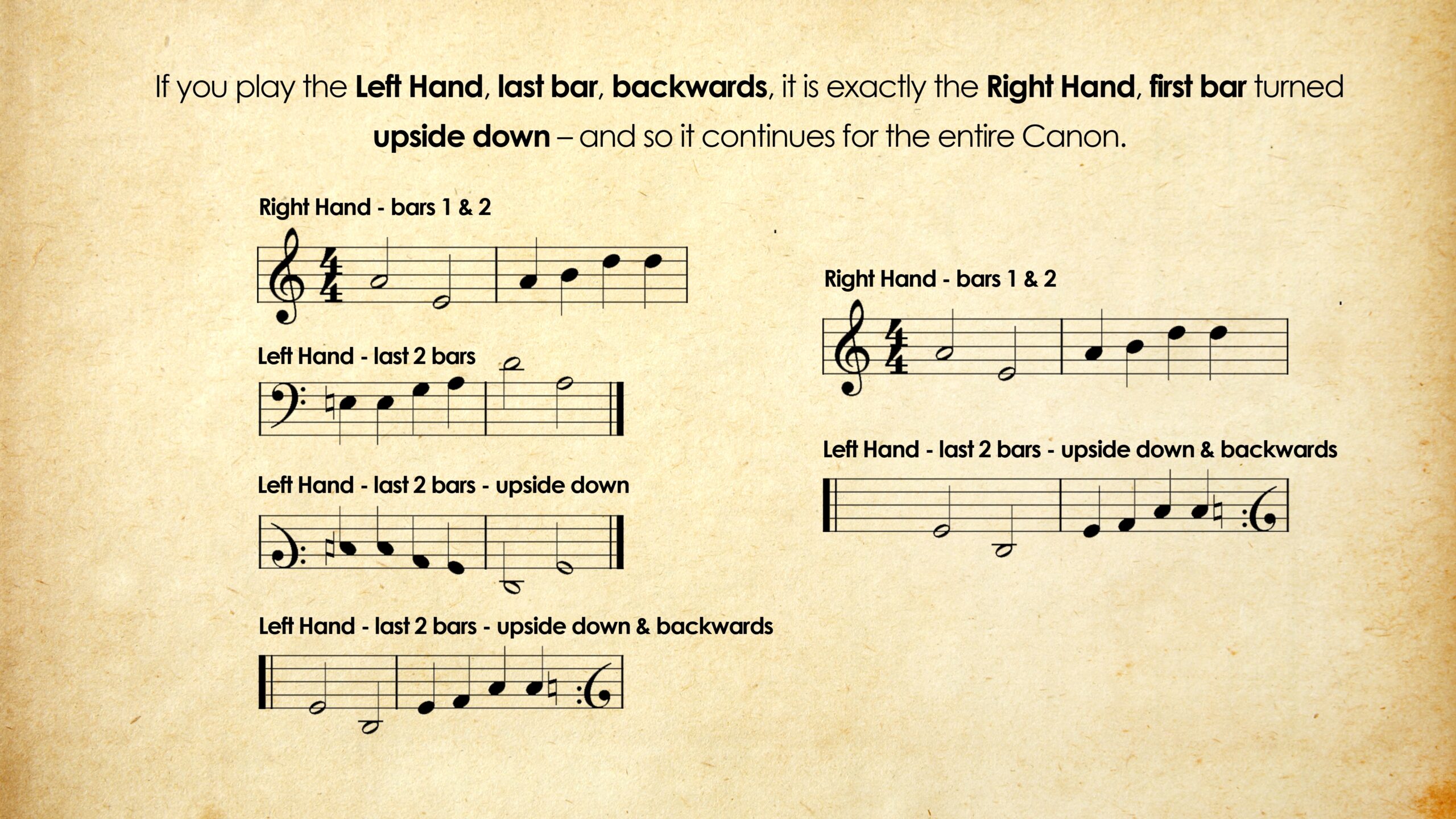 The entirety of Voice 2 (piano left hand) is the whole of Voice 1 (piano right hand) played backwards against itself – if you play the last bar of the Left Hand, backwards, it will be exactly the same as the first bar of the Right Hand, forwards – and so it continues for the entire Canon.